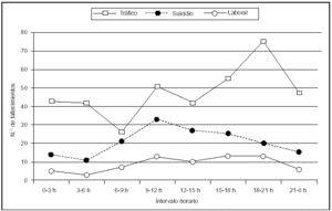 Según la hora en que se produjeron, se observó un predominio diurno para las muertes por suicidio y los accidentes laborales (fig. 3). Los accidentes de tráfico presentaban un pico de máxima siniestralidad en la franja horaria comprendida entre las 18:00 y 21:00 h. El 51,7% de los que fallecieron entre las 00:00 y las 06:00 de la mañana eran jóvenes con edades comprendidas entre los 16 y 30 años.