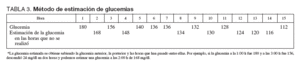Todos los datos recogidos se introdujeron en una base de datos de Excel. Se calculó la glucemia media diaria para cada paciente. Se agruparon los valores de glucemia en distintos tramos (100-140 mg/dl, 141160 mg/dl, etc.), calculándose el porcentaje de glucemias realizadas que estaban en cada tramo. Por último, se analizaron el número de horas que el paciente estaba en cada tramo de glucemia. Para ello, como no siempre es preciso realizar glucemia horaria, hubo que estimar la glucemia en las horas en las que no se realizó. Dado que el aporte de glucosa e insulina era continuo, esta estimación pudo hacerse sabiendo la glucemia anterior, la posterior y el número de horas entre ellas. Tras calcular lo que subía o bajaba la glucemia cada hora, se estimó, una a una, la glucemia que habría tenido en aquellas horas en las que no se realizó, según se muestra en el ejemplo de la tabla 3.