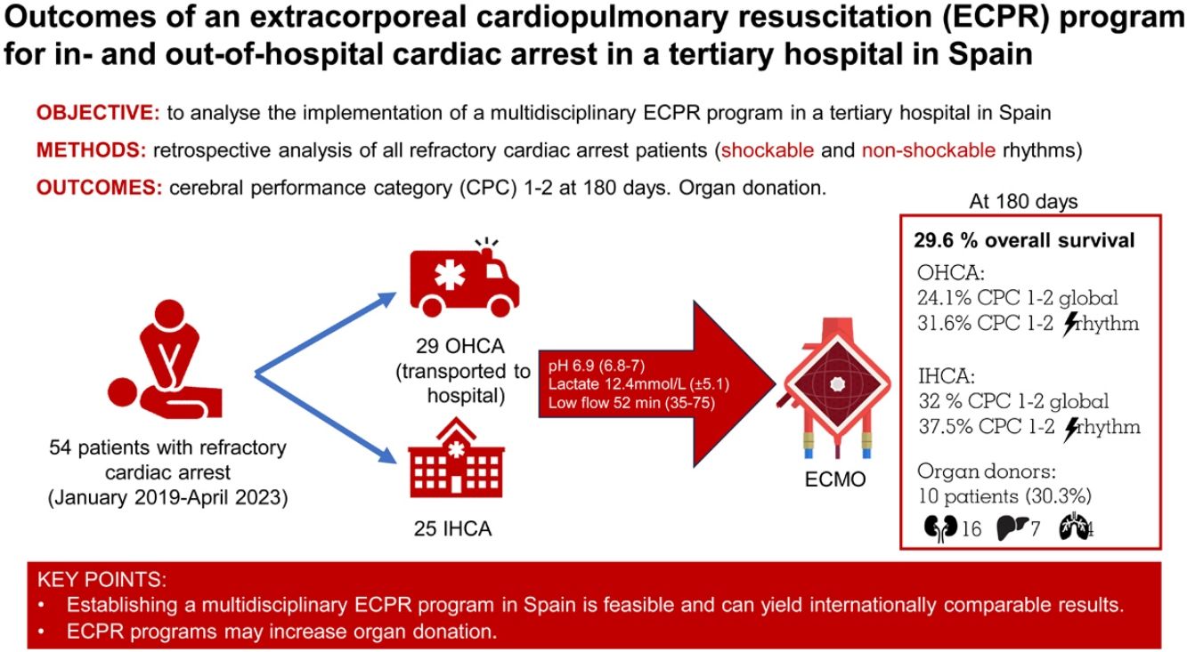 ConclusionsThe implementation of a multidisciplinary ECPR program in an experienced Extracorporeal Membrane Oxygenation center in Spain is feasible and can lead to good survival outcomes and valid organ donors.