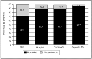 Tampoco la necesidad de politransfusión ni el uso de agentes inotrópicos y vasoactivos se relacionaron con la mortalidad, hechos que nos hacen reflexionar sobre la utilidad del tratamiento enérgico en estos pacientes (se emplearon agentes inotrópicos y vasoactivos aproximadamente en el 30% de los casos), pero este punto no lo hemos podido corroborar con la bibliografía consultada, a excepción de dos estudios en los que dicho soporte, como en nuestro caso, no reportó ningún tipo de beneficio11,23.