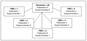 Fig. 2. Mortalidad intra-UCI de los pacientes hematológicos según el número de disfunciones or gánicas19 (FMO).