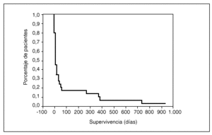 A los 10 días tras el ingreso en la UCI la supervivencia era del 50%, a los 39 días del 25% y a los 61 días del 17%; tras 2 años de seguimiento, la supervivencia era del 3,3% (fig. 3). Ninguna de las variables analizadas ha demostrado relación con la supervivencia a largo plazo de los pacientes y, asimismo, el análisis multivariante no ha detectado variables influyentes para este resultado.