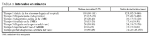 La hora en que es atendido por el intensivista de guardia y la hora de salida en UME desde nuestro hospital (tiempos recogidos por el intensivista de guardia).