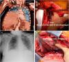(A) A preoperative computed tomography (coronal slice) scan of the chest and upper abdomen confirmed a right hemidiaphragmatic hernia, showing a liver in the right chest. (B) Image during repair surgery. A wide diaphragmatic defect showed protrusion of the liver through it. (C) Postoperative chest radiograph after surgical repair. (D) The surgical suture appreciated the width of the diaphragmatic tear.