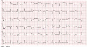 Mujer que consulta por dolor torácico. El electrocardiograma (fig. 1) es compatible con un síndrome coronario agudo con elevación del segmento ST. Se realiza una coronariografía urgente donde se observa una arteria coronaria derecha (CD) sin lesiones, una arteria coronaria descendente anterior (DA) con abundante material trombótico, abarcando la salida de una gran rama diagonal (Dg) que posee pequeñas ramificaciones que irrigan el territorio de una teórica arteria coronaria circunfleja (Cx) que no se consigue visualizar. Se revascularizan las lesiones de las arterias coronarias. Posteriormente, en la angiografía coronaria por tomografía computarizada (fig. 2) se confirma la ausencia congénita de la Cx. La paciente evoluciona a un shock cardiogénico debido a la gran área isquémica.