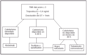 Si existe diponibilidad de cateterismo inmediato: a) realizar angiografía (+ revascularización si procede) bajo tratamiento con abciximab, y b) mantener abciximab durante 12 h tras el procedimiento.