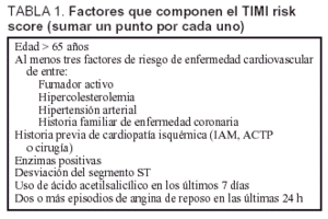 1. Debemos identificar rápidamente los pacientes de alto riesgo. Siguiendo el planteamiento del estudio TACTICS podemos utilizar para definir a estos pacientes un TIMI risk score14 ≥ 3 y/o Tn positiva/desviación del ST > 1 mm). Los factores considerados en el TIMI risk score se exponen en la tabla 1.