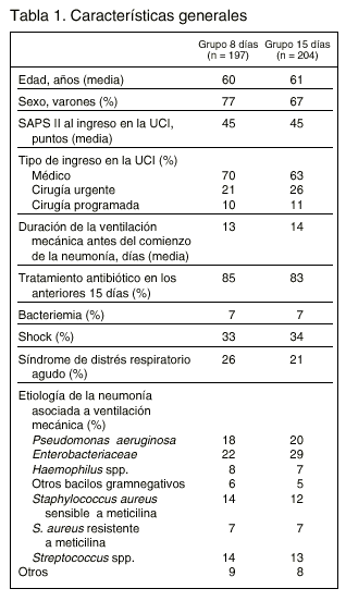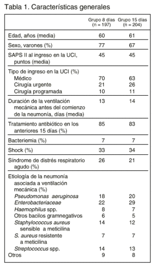 Objetivo:evaluar si un tratamiento antibiótico durante 8 días es tan eficaz como un tratamiento de 15 días en los pacientes con neumonía asociada a la ventilación mecánica que han recibido tratamiento empírico inicial adecuado.