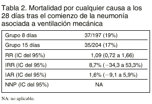 Conclusiones de los autores:en los pacientes con NAVM que han recibido un tratamiento antibiótico empírico adecuado, un tratamiento de 8 días de duración tiene la misma eficacia clínica que uno de 15 días. Es posible que esta conclusión no sea válida para los pacientes con infección producida por bacilos gramnegativos no fermentadores.