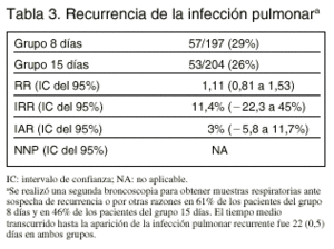 Entre los pacientes que presentaron recurrencia de la infección pulmonar, la aparición en muestras diagnósticas de microorganismos multirresistentes fue significativamente inferior en el grupo de 8 días (42 frente a 62%, p = 0,04).