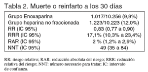 Conclusiones de los autores: en los pacientes con infarto de miocardio con elevación del segmento ST que son tratados mediante fibrinólisis, el tratamiento con enoxaparina es de eficacia superior al tratamiento con heparina no fraccionada pero se asocia a un aumento de los episodios de sangrado mayor.