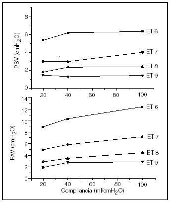 En la última parte del estudio, observamos que a mayor resistencia se precisaba mayor PSV (fig. 4), mientras que con mayor compliancia se necesitaba mayor PAV (fig. 5), aunque la magnitud del efecto era mucho menos importante que los efectos del flujo y del tiempo inspiratorio.
