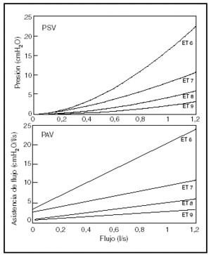 Desde un punto de vista teórico, tanto PSV como PAV podrían tener una eficacia similar para compensar la resistencia del tubo traqueal. Para una resistencia dada, básicamente definida por el diámetro del tubo traqueal y el flujo inspiratorio, la PSV aplicaría la cantidad de presión necesaria para compensar esta resistencia, mientras que la PAV aplicaría la presión resultante del multiplicador de flujo. No obstante, el efecto tanto de la PSV como de la PAV variarán ante cambios en las características mecánicas pulmonares del paciente.