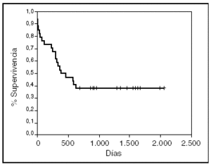 Catorce enfermos fallecieron en su domicilio tras el alta hospitalaria (41,2%). Por tanto, la mortalidad global fue del 62,2% durante el período de estudio. La mediana de la supervivencia fue de 383 días (38,7-728) para un seguimiento que varió desde 684 a 2.062 días (fig. 1).