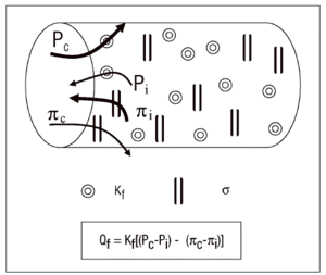 Figura 1. Ecuación de Starling. Kf: coeficiente de filtración; Pc y Pi: presiones hidrostáticas capilar e intersticial; *: coeficiente de reflexión oncótica;¼c y ¼i: presiones coloidosmóticas capilar e intersticial.