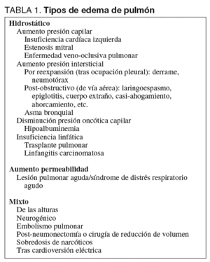 Clásicamente el edema pulmonar se clasifica en dos grandes grupos atendiendo al mecanismo de producción5. El primero, denominado hidrostático, se debe a cambios en los factores (presión capilar, intersticial u oncótica) que afectan al movimiento de fluidos a través de una membrana semipermeable intacta. El segundo grupo lo compondrían aquellos cuyo origen se encuentra en un daño primario de la membrana alveolocapilar, con la consiguiente alteración de la permeabilidad. A pesar de la aparente simplicidad y rigor en el criterio utilizado, el problema es determinar con precisión, para cada condición clínica, cuál es el mecanismo principal implicado. Es por ello que muchos se agrupan en un gran cajón de sastre denominado de tipo mixto (tabla 1). La novedad en este campo proviene de haberse resuelto la incógnita sobre algunos de los modelos de edema de pulmón que estaban asignados a este último grupo. Así, los edemas neurogénico6 y por re-expansión7 se consideran actualmente como predominantemente hidrostáticos. Especialmente significativo ha sido el caso del edema de pulmón asociado a las alturas (HAPE en su acrónimo inglés), que tras una serie de estudios bien diseñados8,9 se ha concluido que es del tipo hidrostático, consecuencia de una vasoconstricción hipóxica de carácter heterogéneo, que conduce a un incremento regional de las presiones capilares. Además, y su notoriedad deriva en gran parte de ello, ha sido el tipo de edema sobre el que se ha ensayado alguno de los tratamientos más prometedores en este ámbito.