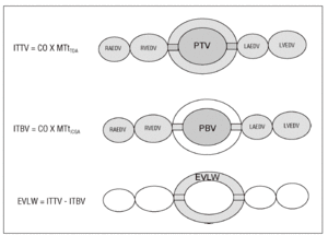 Figura 3. Método del doble indicador. ITTV: volumen de fluidos intratorácico; CO: gasto cardíaco; MTtTDA: tiempo medio de tránsito del indicador térmico (difusible); ITBV: volumen sanguíneo intratorácico; MTtICGA: tiempo medio de tránsito del indicador no difusible; EVLW: agua pulmonar extravascular; PTV: volumen de fluidos pulmonar; PBV: volumen sanguíneo pulmonar; RAEDV: volumen telediastólico de aurícula derecha; RVEDV: volumen telediastólico de ventrículo derecho; LAEDV: volumen telediastólico de aurícula izquierda; LVEDV: volumen telediastólico de ventrículo izquierdo.