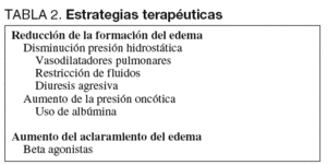 Habida cuenta de que no se dispone aún de ningún tratamiento farmacológico que actúe restableciendo a la normalidad la permeabilidad de la membrana alveolo-capilar lesionada, éstas se dirigen a minimizar la cantidad de edema. Lo hacen a través de dos mecanismos generales, siguiendo la fisiopatología revisada (tabla 2). El primero consiste en la reducción en la formación de edema, evitando el paso de más líquido del espacio vascular alveolar. El segundo se vale de la activación de los procesos normales de aclaramiento del edema una vez ya producido.
