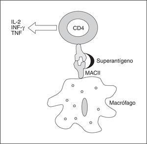 Figura 2. Esquema de la actuación de un superantígeno en una sepsis por grampositivos. Las abreviaturas se explican en el texto.