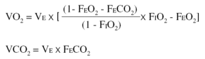 Donde VE es el volumen minuto espirado en ml/min y corregido a condiciones STPD, FIO2 y FEO2 son las fracciones inspirada y espirada de O2 y FECO2 es la fracción espirada de CO2. El valor del VO2 y la VCO2 fue la media de dos mediciones.