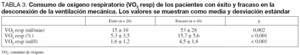 Figura 1. Valor del coste en oxígeno de la respiración (VO2 resp) de los pacientes con éxito y fracaso en la desconexión de la ventilación mecánica.