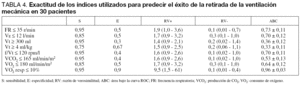 Los valores umbral obtenidos en este estudio que permiten distinguir entre éxito o fracaso de la desconexión se resumen en la tabla 4. Un valor de VO2 resp menor o igual a 10% presentó la mejor sensibilidad, especificidad, razón de verosimilitud positiva y negativa y el mayor valor del área bajo la curva ROC (0,96 ± 0,03) para predecir el éxito de la desconexión de la VM. El error de clasificación fue del 7% para el VO2 resp y mayor del 20% en todos los demás índices de predicción del éxito de la desconexión.