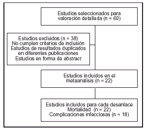Criterios de exclusión: a) estudios que únicamente reportaran el efecto sobre variables nutricionales o inmunológicas, y b) estudios sobre dietas enterales que contuvieran un solo inmunonutriente de los cuatro habitualmente utilizados.