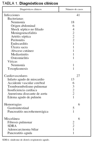 Las infecciones bacterianas corresponden a un 52,4% del total, seguido de patologías cardiovasculares con un 23,8%, y el resto corresponde a otro tipo de patologías como amiloidosis, infección vírica, hemorragia digestiva alta, vasculitis y aspergilosis.
