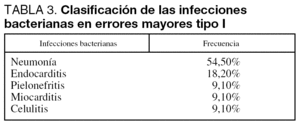 Dentro de las infecciones bacterianas las neumonías son la causa más frecuente (54,5%) seguidas de las endocarditis (18,2%) (tabla 3).