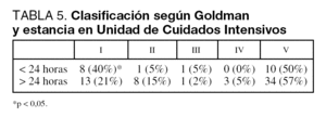 Con estos resultados podemos observar que los errores mayores tipo I se presentan con más frecuencia en los pacientes con una estancia inferior a 24 horas con un 40%, frente a un 21% de los pacientes con una estancia superior a 24 horas (p < 0,05) (tabla 5).