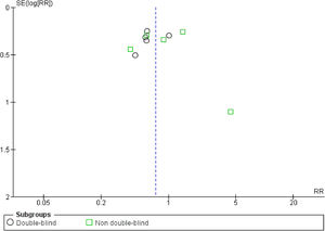 Risk of biasOf the total trials included, five were double-blinded,15,16,18,19,22 two were single-blinded,20,23 and three were open-label.9,17,21 Less studies reported mortality (n=6) than VAP incidence (n=10), suggesting reporting bias. At least half of the included trials presented some concerns regarding missing outcome data. 60% of the studies showed some drawbacks in the randomization process. Only 50% of the RCTs presented low risk of bias (overall). Fig. S2 shows the risk of bias summary and graph of all included studies. No publication bias was observed (Fig. S3).