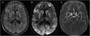 A 70-year-old woman with a history of chronic obstructive pulmonary disease, hypertension, and heart failure was transferred to our hospital after an episode of witnessed out-of-hospital cardiac arrest, for which she received 20min of cardiopulmonary resuscitation. At admission, she was comatose, requiring intubation. Neurological examination showed an absence of brainstem reflexes without any pharmacological influence. Twelve hours later, a magnetic resonance imaging (MRI) of the brain (Fig. 1) showed extensive bilateral, cortical–subcortical and basal ganglia hyperintensities on the fluid-attenuated inversion recovery sequence (A) with restricted diffusion (B) and normal arterial blood supply (C); findings consistent with hypoxic–ischemic brain injury (HIBI). The patient died 48h after admission. The current guidelines for HIBI suggest performing a brain MRI 2–5 days after the event, however recent data shows that the diffusion-weighted imaging (DWI) sequence on an MRI can predict neurological outcomes as early as 3h after this catastrophic event.