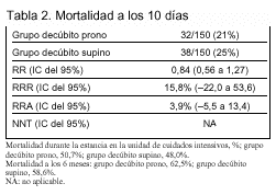Conclusiones de los autores: el uso de decúbito prono mejora la oxigenación de los pacientes con SDRA, con bajo índice de complicaciones graves. Sin embargo, su uso rutinario no produce un descenso de la mortalidad en este grupo de pacientes. Los autores refieren que en análisis post hoc los pacientes con PaO2/Fi O2 <= 88 mmHg o SAPS > 49 tenían menor mortalidad a los 10 días en el grupo tratado con decúbito prono en comparación con el grupo mantenido en decúbito supino. Esta diferencia desaparecía al alta de la UCI.