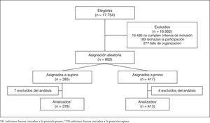 Grupo supino: colocación en posición semiincorporada (30º). Los pacientes podían ser colocados en posición de decúbito prono si presentaban hipoxemia grave (PaO2/FIO2 < 100 mmHg durante más de 12 horas o PaO2/FIO2 < 60 mmHg durante más de 1 hora, en ambos casos recibiendo oxígeno puro).
