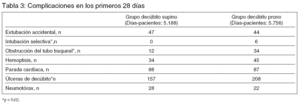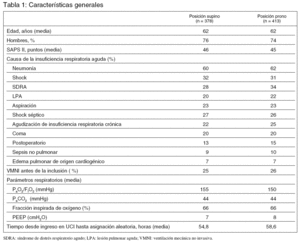 Resultados principales (tabla 2): En el grupo de prono, el tiempo medio de permanencia en esta posición fue de 8,6 horas diarias durante una media de 4,1 días. La tasa de neumonía asociada a la ventilación mecánica fue menor en el grupo de decúbito prono: 16,6 episodios por 1000 días de intubación frente a 21,4, (p = 0,045).