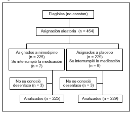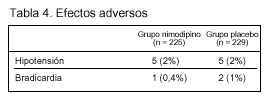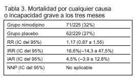 Resultados principales (tablas 3 y 4): El estudio fue interrumpido cuando se había reclutado menos de la mitad del tamaño muestral calculado, ya que en el análisis intermedio no se apreciaban diferencias clínicamente relevantes entre los pacientes tratados con nimodipino y los tratados con placebo.