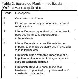 Desenlaces principales: mortalidad por cualquier causa o dependencia para las actividades de la vida diaria, definida como una puntuación en la escala de Rankin modificada > 3 a los tres meses (tabla 2). La valoración del estado del paciente a los tres meses se hizo mediante llamada telefónica realizada por enfermera. Para estimar la variabilidad interobservador en la apreciación del grado de afección se escogió una muestra de 116 pacientes consecutivos a los que dos enfermeras independientemente llamaron por teléfono, con un intervalo de un día. El acuerdo interobservador fue casi perfecto (kapa = 0,94)