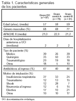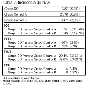 Conclusiones de los autores: la descontaminación orofaríngea aislada reduce el riesgo de desarrollar NAV. Este efecto no se asocia con una reducción en la estancia en UCI ni con una disminución significativa de la mortalidad. Durante el período de estudio no se apreció resistencia a los antibióticos utilizados en la descontaminación.