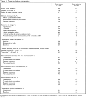 Grupo de estrategia invasiva selectiva: realización de angiografía si angina refractaria a pesar del tratamiento médico, inestabilidad hemodinámica o del ritmo cardíaco, o demostración de isquemia miocárdica en una prueba de esfuerzo previo al alta hospitalaria. También se realizó angiografía y revascularización cuando tras el alta hospitalaria aparecieron síntomas graves de angina o cuando se documentó isquemia mediante alguna prueba diagnóstica.