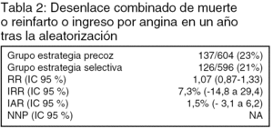 En pacientes con SCASEST de alto riesgo, el empleo de una estrategia invasiva precoz en lugar de una estrategia invasiva selectiva no modifica el desenlace combinado de muerte, infarto no-fatal y rehospitalización por angina en el primer año.