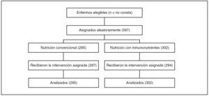 Grupo inmunonutrición: empleo de una fórmula de nutrición enteral hiperproteica enriquecida con glutamina, arginina, ácidos grasos ω3, antioxidantes y con mezcla de fibras. Grupo control: empleo de fórmula isocalórica y normoproteica. Se eligió la dieta estándar empleada en las UCI participantes antes del comienzo del estudio.