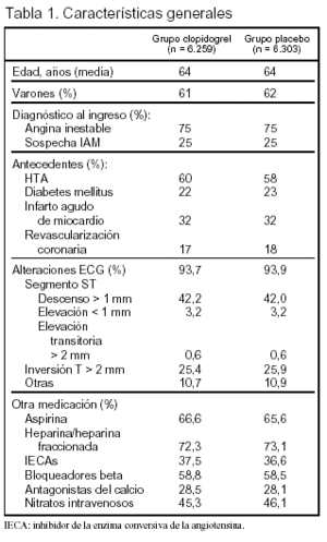 Objetivo: comparación de la eficacia y seguridad de clopidogrel y aspirina frente a placebo y aspirina en el síndrome coronario agudo sin elevación del segmento ST.