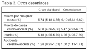 Grupo tratamiento: clopidogrel, 300 mg diarios como dosis inicial y 75 mg diarios posteriormente, de 3 a 12 meses.
