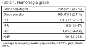 La adición de clopidogrel a la aspirina en el síndrome coronario agudo sin elevación del segmento ST reduce la incidencia combinada de muerte por causa vascular, infarto de miocardio no mortal y accidente cerebrovascular el 2,1% y aumenta el riesgo de hemorragia grave el 1%.