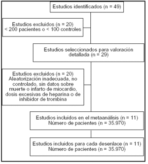 Criterios de inclusión: ensayos clínicos con asignación aleatoria con un mínimo de 200 pacientes y con al menos 100 controles, que presentaran resultados sobre mortalidad e infarto de miocardio, que compararan un inhibidor directo de la trombina con heparina y que incluyeran a pacientes con las características previamente descritas.