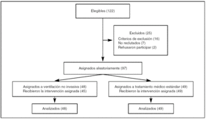 Criterios de exclusión:1. Coma. 2. Incapacidad para una adecuada protección de la vía aérea definida como Airway Care Score ≥ 124. 3. Problemas para la deglución. 4. Lesión en la columna cervical. 5. Enfermedad neuromucular. 6. Falta de consentimiento informado. 7. Agitación o falta de cooperación. 8. Defectos anatómicos que interfieren con la fijación de la máscara. 9. Arritmias o isquemia cardiaca no controladas. 10. Fracaso de más de dos órganos. 11. Obesidad mórbida (índice de masa corporal ≥ 30). 12. Síndrome de apnea del sueño. 13. Ventilación mecánica domiciliaria.