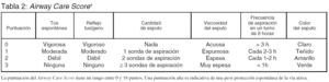 Los Criterios Menores de reintubación fueron: a) aumento > 20% de la frecuencia respiratoria desde el momento de la extubación y, en cualquier caso, frecuencia respiratoria > 35 resp./min; b) signos clínicos de fatiga respiratoria (utilización de músculos accesorios, respiración abdominal paradójica); c) disnea grave; d) incapacidad para expulsar secreciones (Airway Care Score > 12).