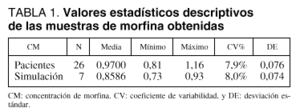 La determinación de las concentraciones de morfina de las 33 muestras (26 procedentes de pacientes y 7 de la perfusión teórica) aportó diferentes resultados sobre los que se realizó un estudio estadístico (tabla 1).