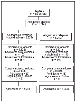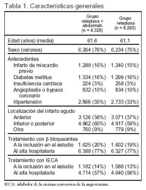 Antecedentes: dos ensayos clínicos de fase II (Speed y TIMI 14) han demostrado que, en pacientes con infarto agudo de miocardio, el tratamiento que combina un inhibidor de los receptores de la glucoproteína plaquetaria IIb/IIIa, abciximab, con la mitad de la dosis habitual de reteplasa o de alteplasa es superior al tratamiento con la dosis habitual de reteplasa o de alteplasa, en cuanto a la obtención de una reperfusión completa a los 90 min. Hasta el momento, ningún ensayo clínico ha evaluado si la mejoría en la reperfusión producida con el tratamiento combinado supone también un efecto beneficioso sobre la mortalidad.
