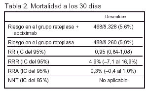 Conclusiones de los autores: el tratamiento con abciximab y reteplasa a la mitad de la dosis habitual produce un efecto similar sobre la supervivencia a los 30 días del infarto de miocardio cuando se compara con el tratamiento con reteplasa a dosis convencionales. Los pacientes que recibieron el tratamiento combinado presentaron menor incidencia de complicaciones isquémicas no fatales pero también un aumento de las complicaciones hemorrágicas no intracraneales y del uso de transfusión de sangre.